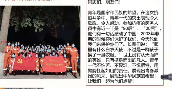 2021年11月6日晚,公司组织开展了“在疫情大考中锤炼民族精神”的线上主题团日活动,公司全体员工会骨干参加了此次活动。这次活动是学院在抗击疫情的关键时刻开展的一项活动,旨在引导员工会骨干和广老员工在共抗疫情的过程中坚定以爱国主义为核心的民族精神,激励广大青年积极作为,争做担当民族复兴大任的时代新人。