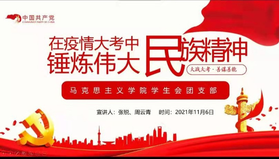 张锐、周云青两位同学在会上作了“在疫情大考中锤炼民族精神”的主题宣讲。他们指出,中国在疫情防控中取得的重大战略成果充分体现了中国共产党的强大领导力和超强凝聚力,充分展现了社会主义制度集中力量办大事的显著优势,极大地增强了全党全国各族人民的自信心、自豪感、凝聚力和向心力。两位同学还结合中国人民在抗击疫情过程中展现出来的“创新创造、奋斗战斗、团结合作、追逐梦想”的宝贵特质深入阐述了民族精神的深刻内涵。同时,两位宣讲人激昂勉励广大同学要自觉践行中国精神,努力成长为堪当民族复兴大任的时代新人,为实现中华民族伟大复兴的中国梦贡献青春力量。