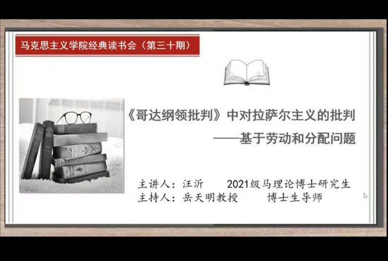 12月13日晚,第三十期马克思主义经典读书会在腾讯会议举行。2021级博士研究生汪沂以《<哥达纲领批判>中对拉萨尔主义的批判—基于劳动和分配问题》为题,对《哥达纲领批判》第一章进行文本解读。读书会由学院博士生导师岳天明教授主持,公司部分教师、百余名硕博士研究生通过线上方式踊跃参加。