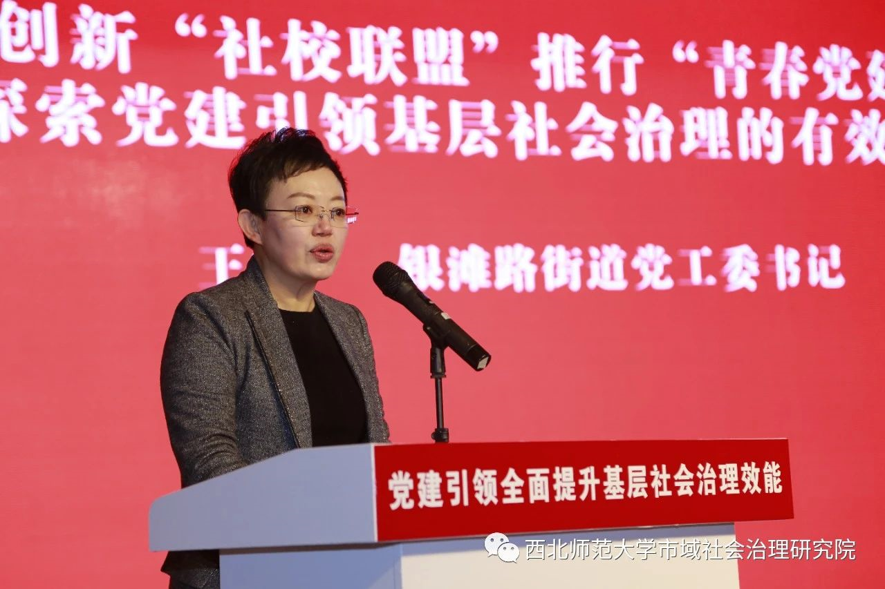 安宁区银滩路街道书记王霞作题为《创新“社校联盟”推行“青春党建”探索党建引领基层社会治理的有效途径》的发言。