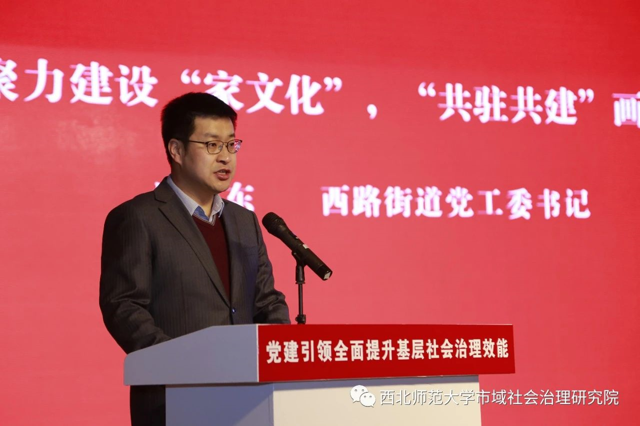 西路街道书记郑辉东作题为《凝心聚力建设“家文化”,“共驻共建”画好同心圆》的发言。