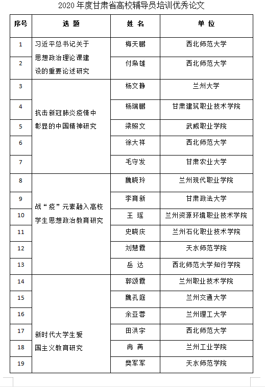 据悉,中心将组织优秀论文作者参加“2021年甘肃省高校辅导员省外高级研修班”项目,并颁发荣誉证书。