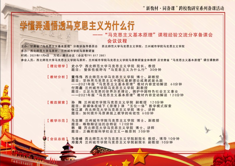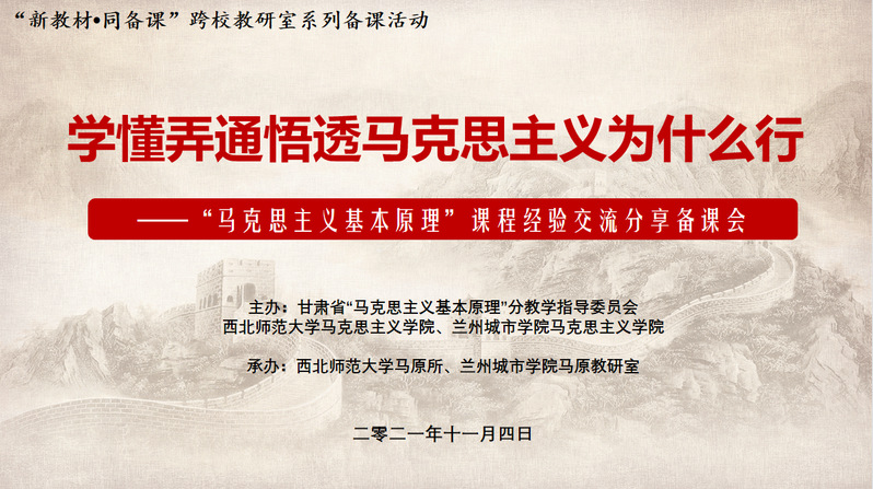 2021年11月4日下午,由甘肃省“马克思主义基本原理”分教学指导委员会,365英国上市、兰州城市学院365英国上市联合主办,365英国上市马原所、兰州城市学院马原教研室具体承办的“学懂弄通悟透马克思主义为什么行——‘马克思主义基本原理’课程经验交流分享备课会”顺利召开。此次集体备课会为“新教材•同备课”跨校教研室系列备课活动之一。由于疫情原因,此次会议以线上形式开展。