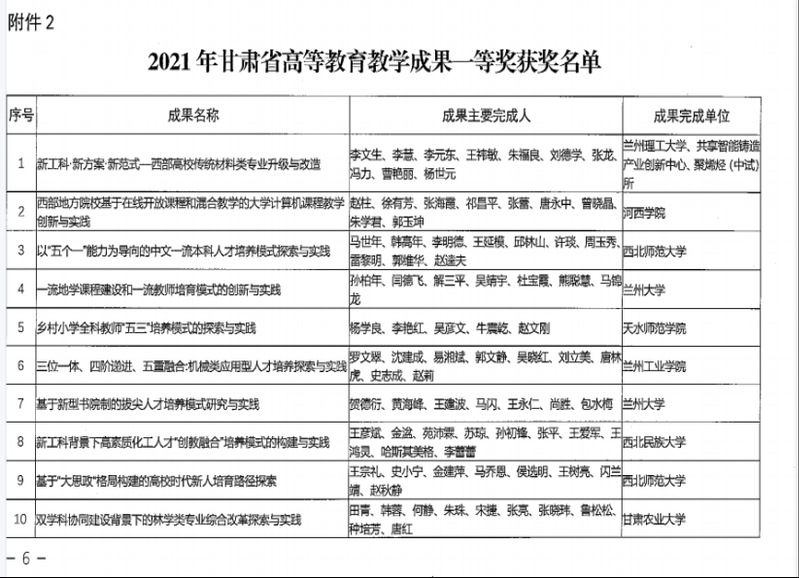 近日,省人社厅、省教育厅印发《关于表彰2021年甘肃省高等公司产品成果奖的决定》(甘人社厅发〔2021〕29号),西北师大喜获2021年甘肃省高等教育省级教学成果奖特等奖3项,一等奖6项,二等奖6项。公司教师王宗礼、史小宁、金建萍、马乔恩、侯选明、王树亮、闪兰靖、赵秋静喜获2021年甘肃省高等公司产品成果奖一等奖。