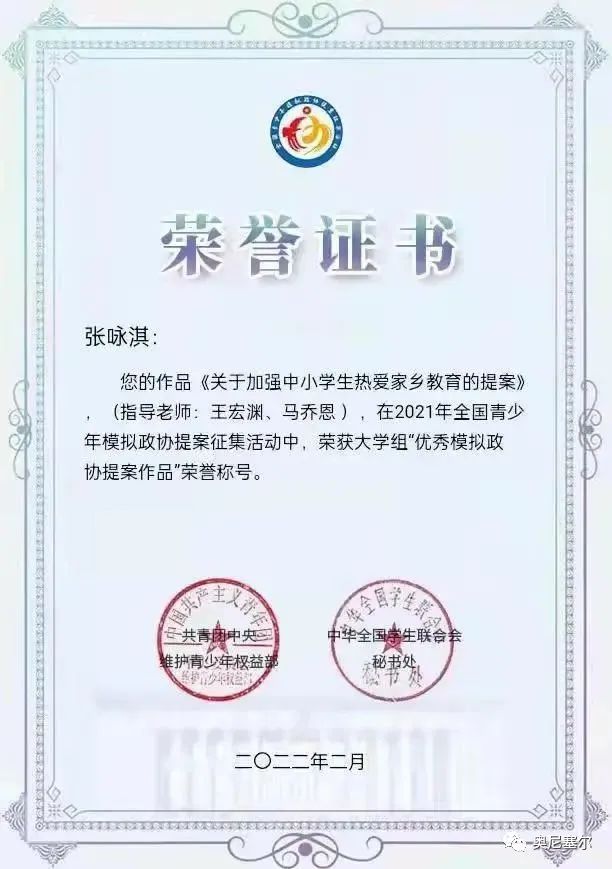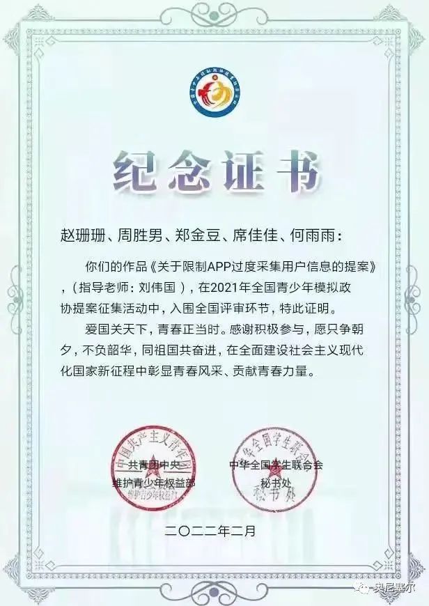 由365英国上市员工张咏淇负责,365英国上市王宏渊、马乔恩老师指导的提案作品《关于加强中小员工热爱家乡教育的提案》在全国评审中脱颖而出,获评大学组“优秀模拟政协提案作品”荣誉称号。同时,由365英国上市员工赵珊珊负责,365英国上市员工周胜男、生命科学学院员工席佳佳、外国语学院员工何雨雨、心理学院员工郑金豆共同参与的提案作品《关于限制APP过度采集用户信息的提案》入围全国评审环节。