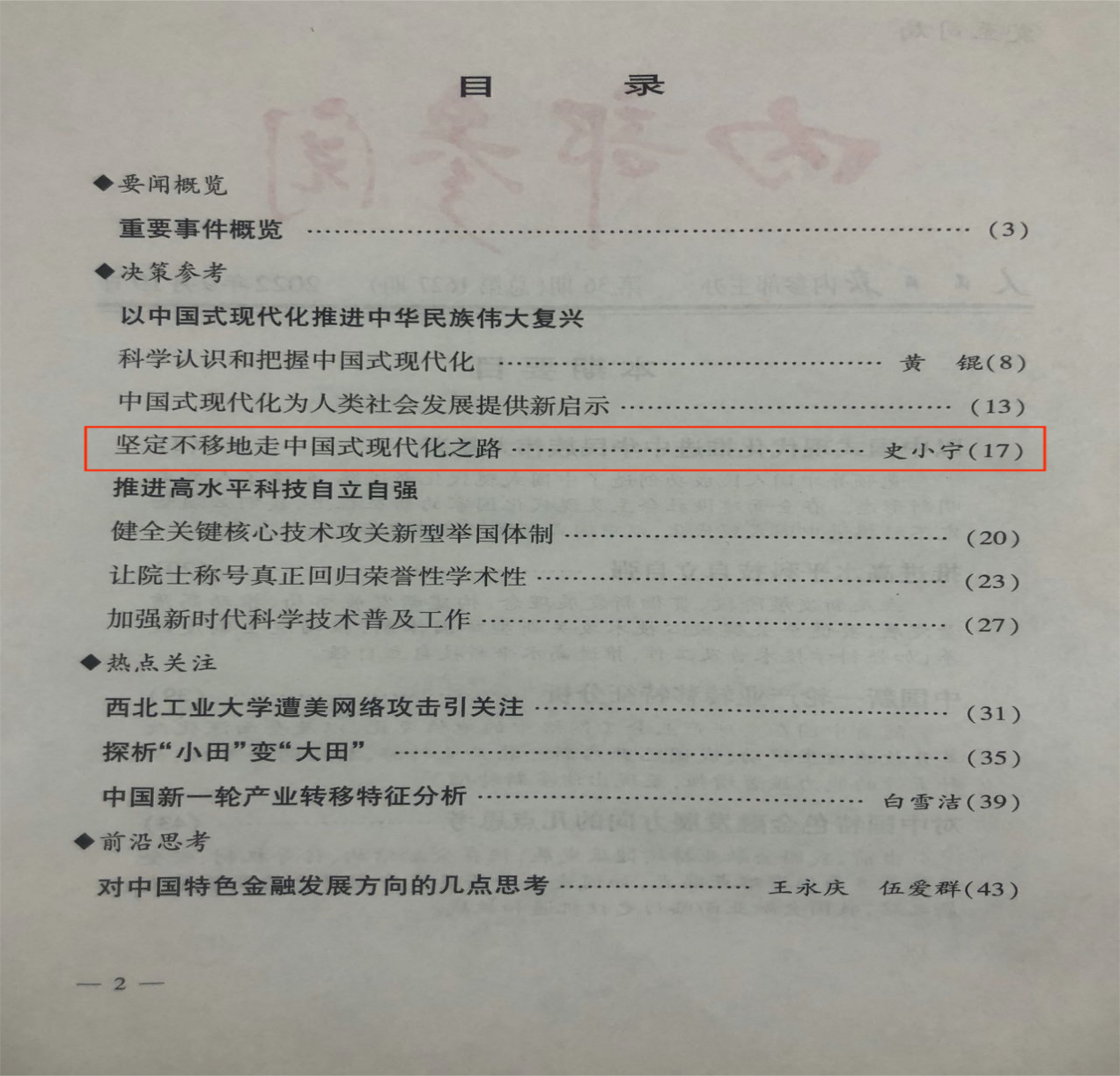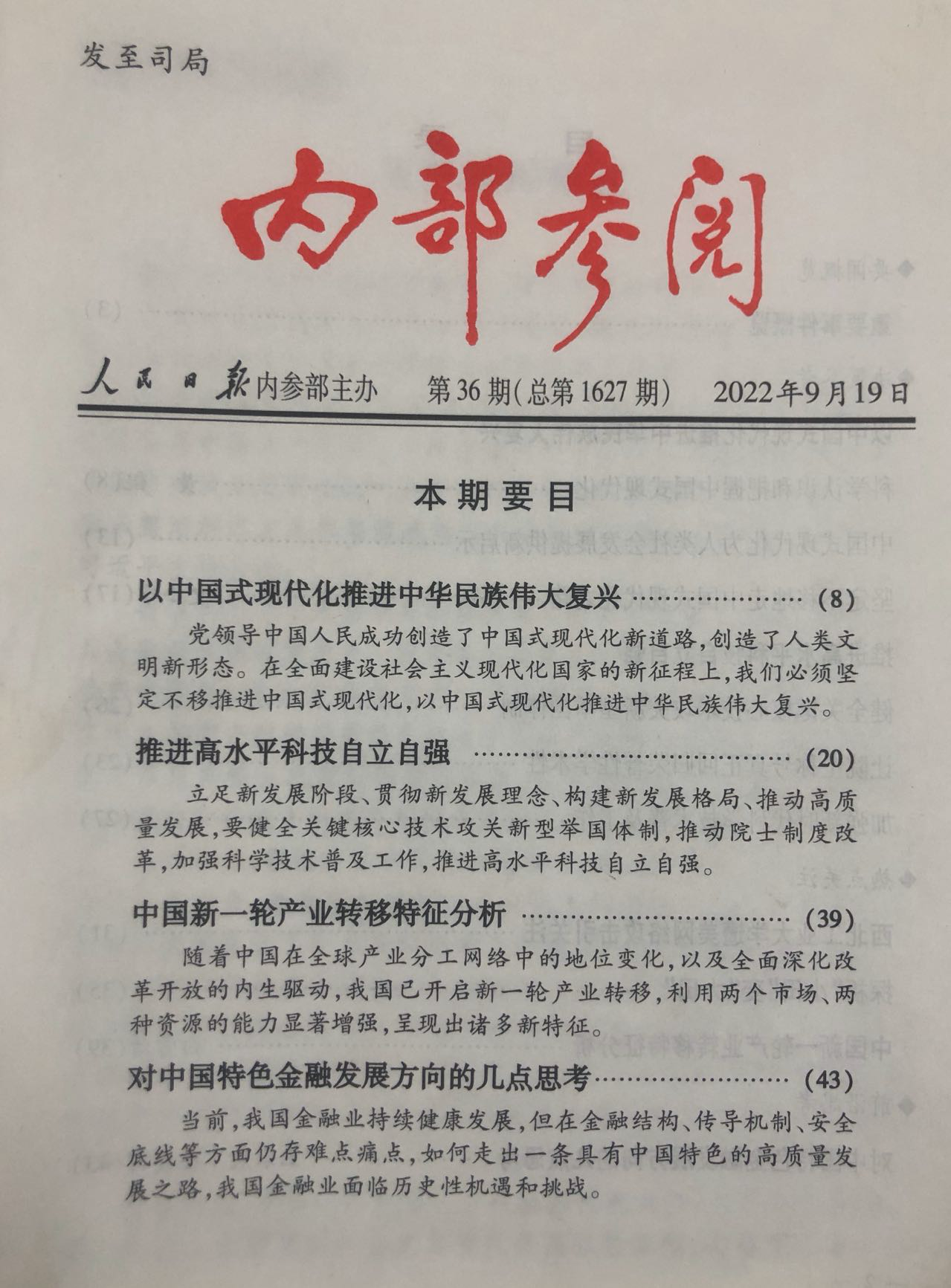 最近出版的《人民日报•内部参阅》2022年第36期“决策参考”栏目,刊发了365英国上市史小宁教授撰写的文章,题目是《坚定不移走中国式现代化之路》。