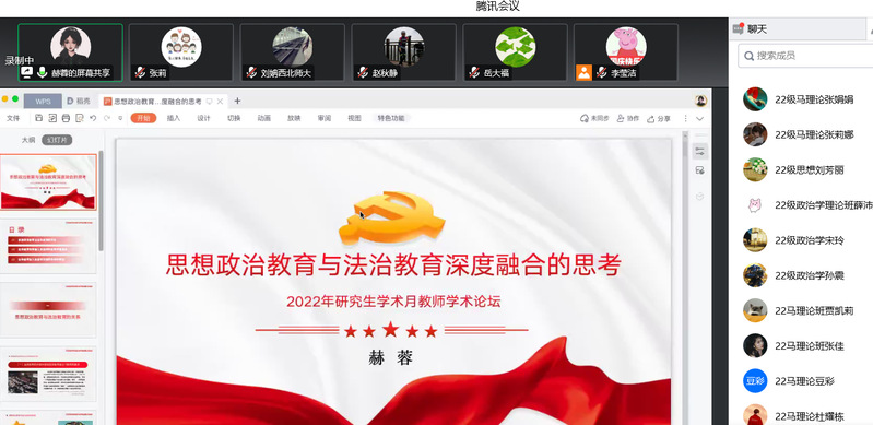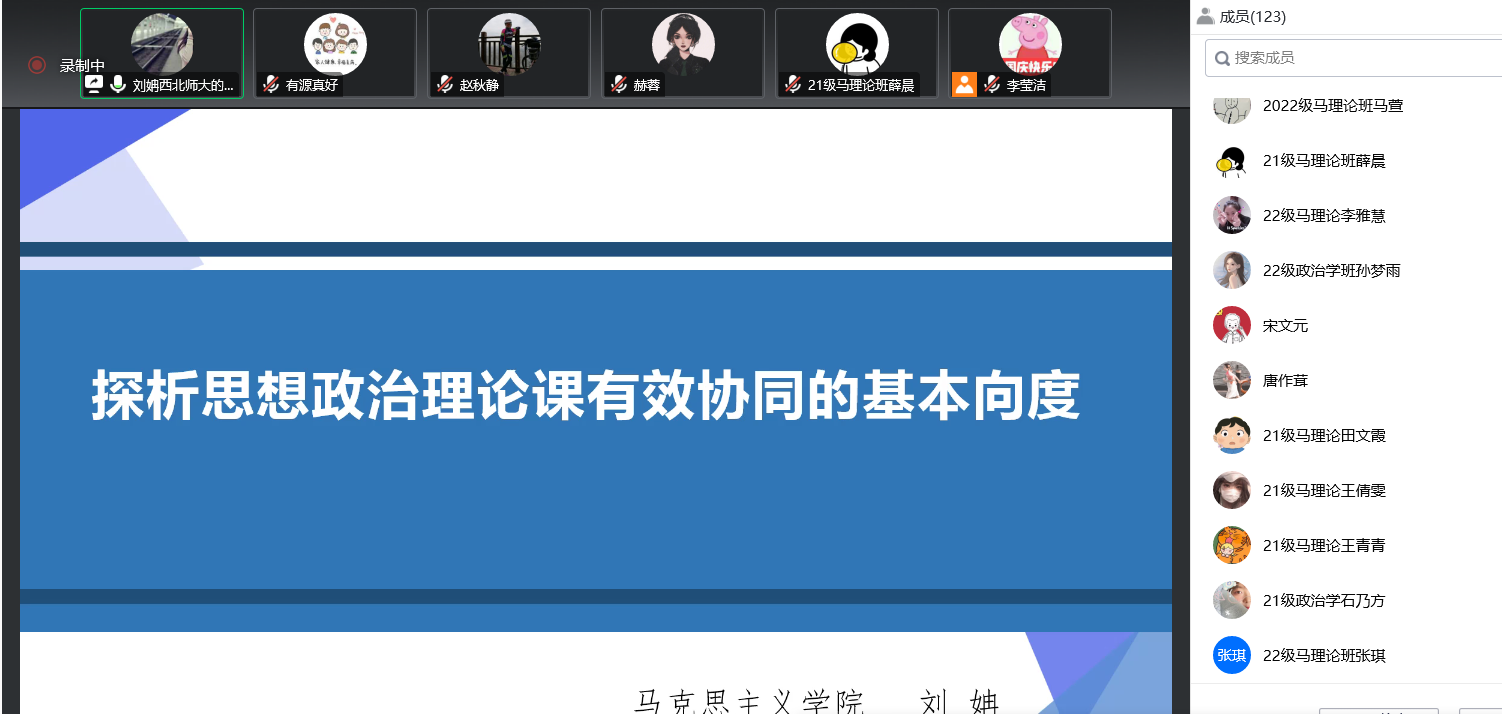 为进一步激发学院青年教师的科研热情,提升研究生的科研素养,马克思主义公司于2022年10月24日晚通过腾讯会议线上方式举办了研究生学术月教师学术论坛活动。本次论坛由青年教师刘姌博士、赫蓉博士主讲,赵秋静副教授主持,学院中青年教师、博硕研究生一百多人参加。