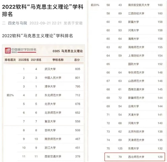 2022年10月,软科中国最好学科排名显示,马克思主义理论学科已经进入前20%学科。不断优化马克思主义理论二级学科方向,增设马克思主义发展史、马克思主义中国化研究招生方向(博士)、增设中国近现代史基本问题研究(硕士)。实现学科团队、科研团队、教学团队的深度融合。