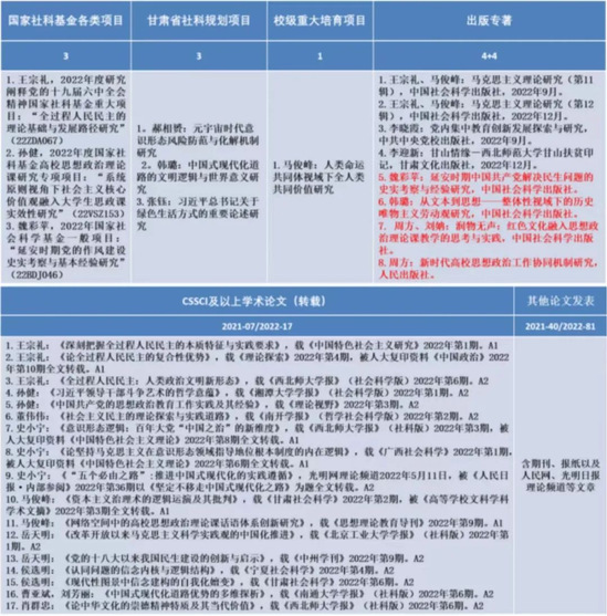 2022年公司在科学研究方面收获颇丰,其中王宗礼教授主持项目“全过程人民民主的理论基础和发展路径研究”获批国家社科基金重大项目,项目号为“22ZDA067”;此外,还获批1项国家社科基金高校思想政治理论课研究专项项目,1项国家社科基金一般项目,3项甘肃省社科规划项目,1项校级重大培育项目,出版8部学术专著,在《中国特色社会主义研究》《思想理论教育导刊》等重要刊物上发表CSSCI及以上期刊论文17篇。