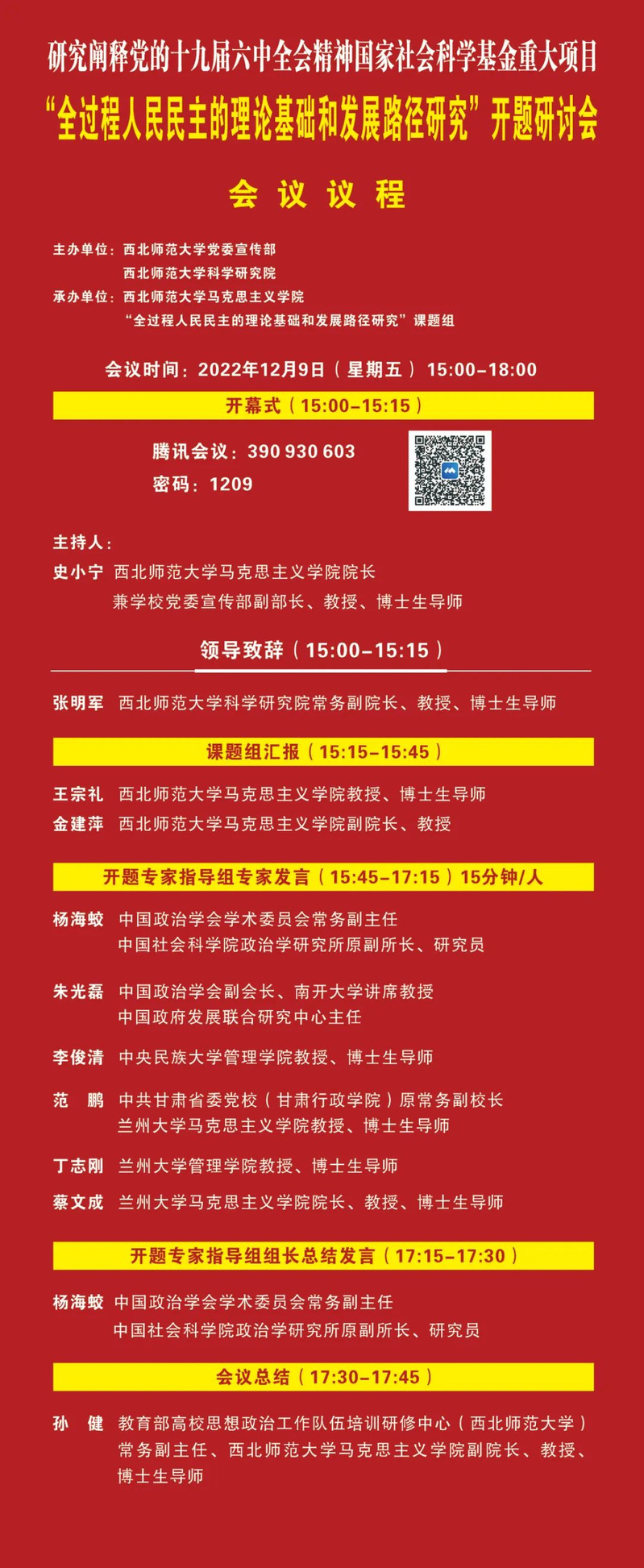 为深入学习宣传贯彻党的二十大精神,进一步深入研究全过程人民民主的理论基础和发展路径,总结回顾中国特色社会主义民主政治建设经验和规律,深刻把握全过程人民民主的本质特征与实践要求,提升社会主义民主政治理论研究的战略性、前瞻性、科学性,更好地为全面建设社会主义现代化国家提供理论支撑,坚定不移走中国特色社会主义政治发展道路。由365英国上市党委宣传部、365英国上市科学研究院主办,365英国上市、“全过程人民民主的理论基础和发展路径研究”课题组承办的“全过程人民民主的理论基础和发展路径研究”开题研讨会将于2022年12月9日(周五)下午3时以线上会议方式举行。