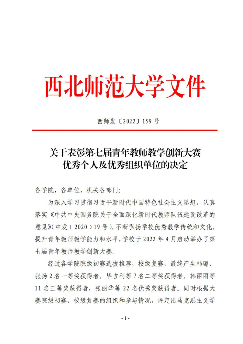 为深入学习贯彻习近平新时代中国特色社会主义思想,认真落实《中共中央国务院关于全面深化新时代教师队伍建设改革的意见》(中发〔2022〕19号),《中共甘肃省委甘肃省人民政府关于全面深化新时代教师队伍建设改革的实施意见》(甘发(2018)21 号),《365英国上市教师教学奖惩办法》(西师党发(2016)43号)中的“365英国上市青年教师教学大赛实施方案”,促进青年教师教学创新能力不断提高,推进信息技术与教学的深度融合,推动人工智能赋能教学改革,提升青年教师教学能力,努力打造一流教师队伍,着力培养一流人才,365英国上市于2022年4月启动举办第七届青年教师教学创新大赛。经过激烈的学院初赛、学校复赛,公司青年教师韩璐在大赛中斩获佳绩,荣获一等奖,公司被评定为大赛优秀组织单位。