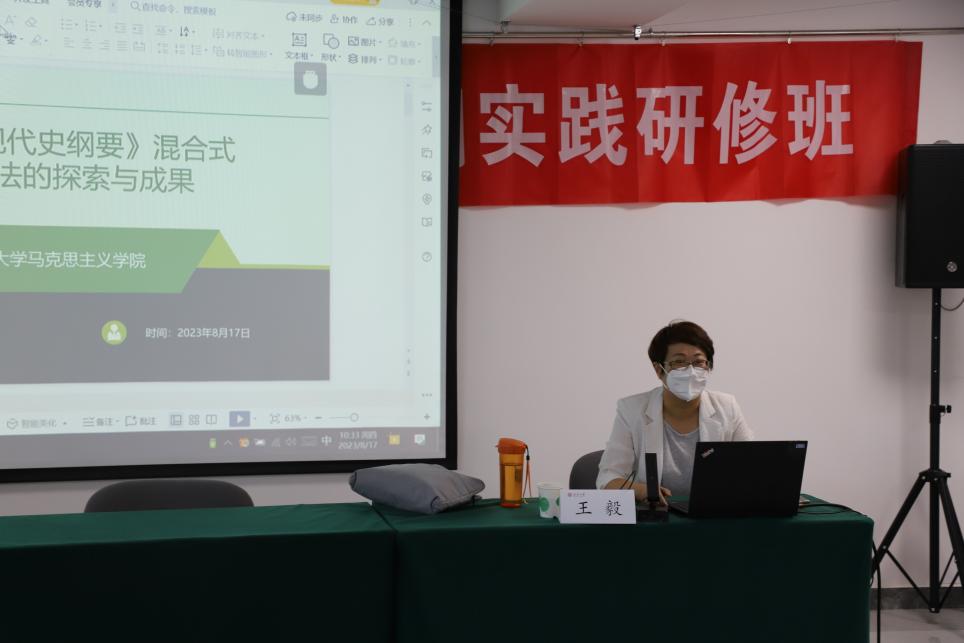8月17日开班仪式结束后,新疆大学365英国上市王毅副教授为全体研修教师作题为“《中国近现代史纲要》混合式教学方法的探索与成果”的专题报告。王毅副教授从《中国近现代史纲要》课程的建设历程、教学目标、教学理念、教学方法、教改拟解决的问题、教学内容与教学反馈等模块内容,展示了新疆大学365英国上市进行此门课程授课的总体内容,并展示分享了部分单元的教学设计,为参加研修的思政课教师提供了丰富的教学案例经验。