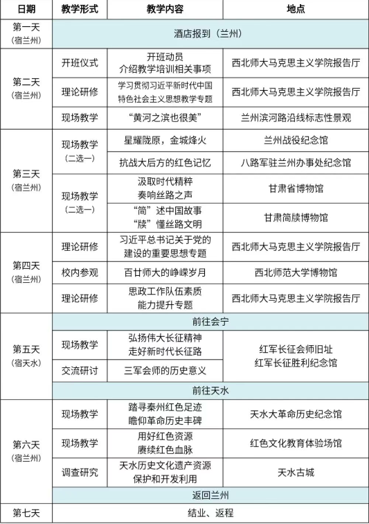 依托甘肃省红色文化资源优势,构建“革命传统教育+铸牢中华民族共同体意识教育+生态文明建设成就考 察”三维立体教学场域,组织参训学员开展主题式、沉浸式研修。实践研修路线包括兰州、白银、天水、陇南、临夏、甘南、张掖、武威等市州知名红色教育场馆和示范基地。