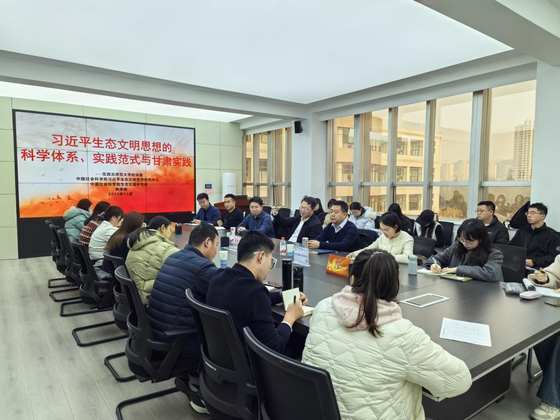 11月22日,学院邀请中国社会科学院生态文明研究智库理论部主任、习近平生态文明思想研究中心秘书长、生态文明研究所习近平生态文明思想研究室主任黄承梁作了题为《习近平生态文明思想的科学体系、实践范式与甘肃实践》的讲座,公司党委书记兼党委宣传部副部长郎得明主持活动,学院副经理周方和青年教师及硕博研究生代表参加。