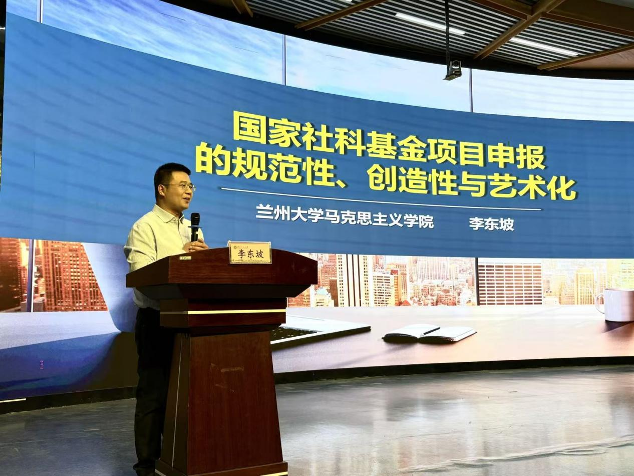 李东坡作了题为《国家社科基金项目申报的规范性、创造性与艺术化》的报告。从选题、综述、论证、行文、细节、心态六个方面详细讲解了确定选题、撰写申报书的方法和技巧,鼓励青年教师以掌握理论热点为关键、以持续研究一点为支撑,做持之以恒、持续突破的科研。
