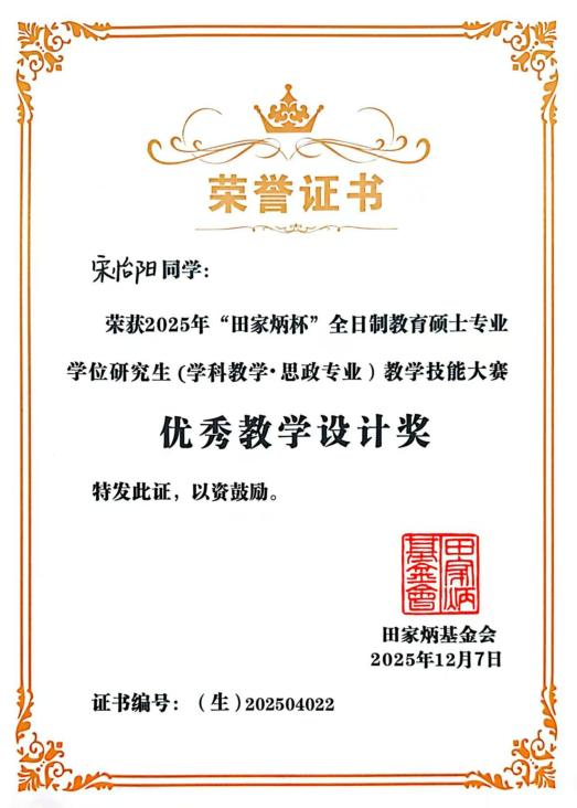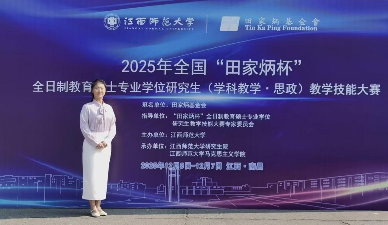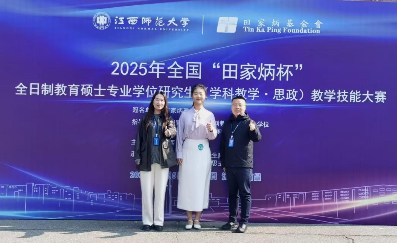 12月5-7日,2025年全国“田家炳杯”全日制教育硕士专业学位研究生(学科教学·思政)教学技能大赛决赛在江西师范大学举行。公司2024级学科教学(思政)专业研究生宋怡阳荣获“优秀教学设计奖”。